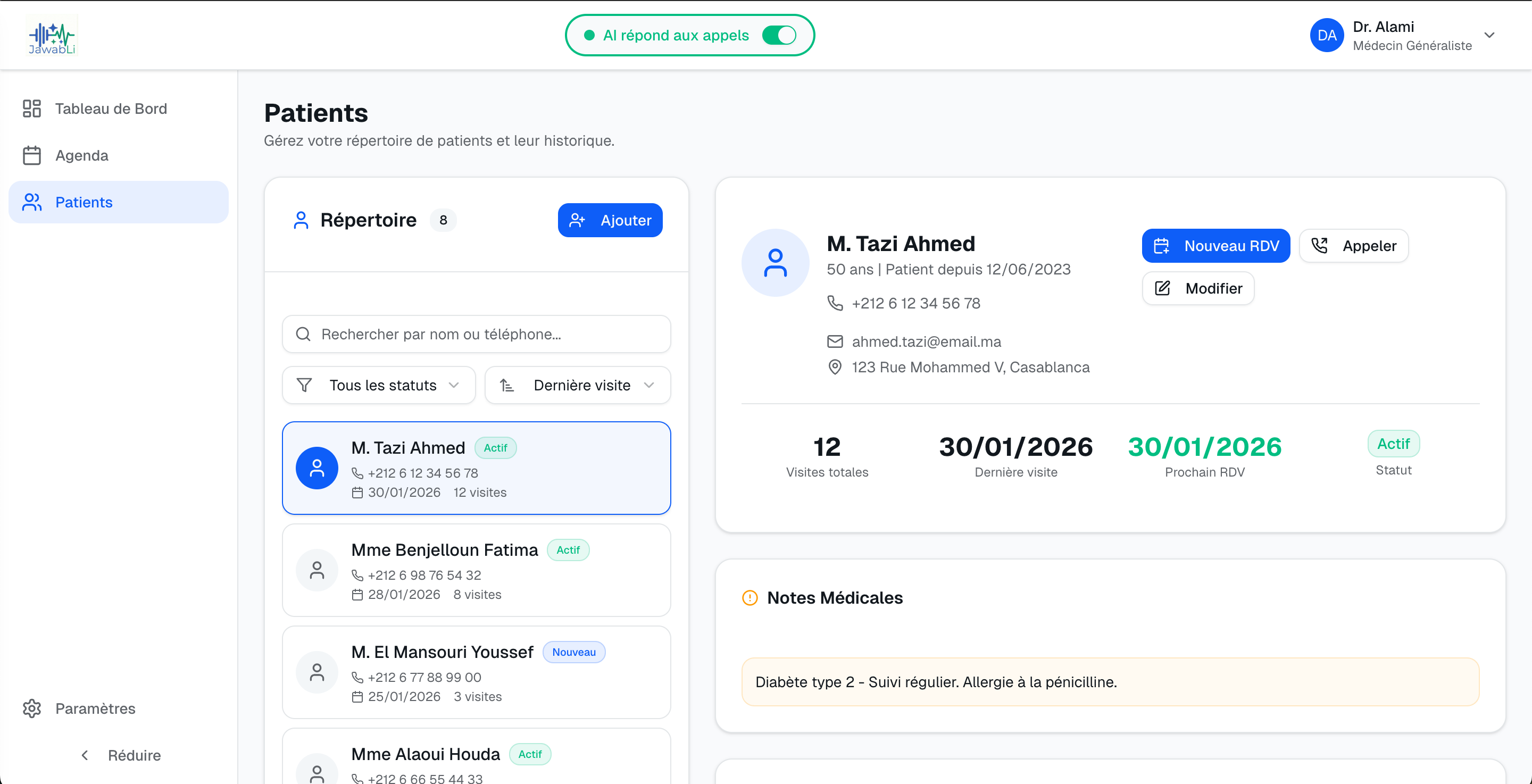 JawabLi est né d'un constat simple mais critique : au Maroc, la médecine se pratique en français, mais les patients s'expriment en Darija. Ce fossé linguistique, couplé à la surcharge administrative des cabinets, entraîne la perte de 20 à 30 % des appels patients.